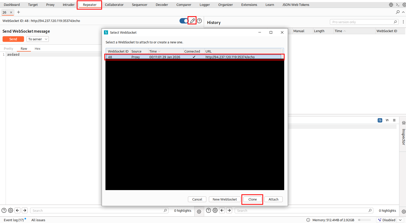 After that, CTRL + SHIFT + R to navigate to Repeater tab. You can manipulate the headers and path by clicking on pencil icon, select the existing websocket connection and clone