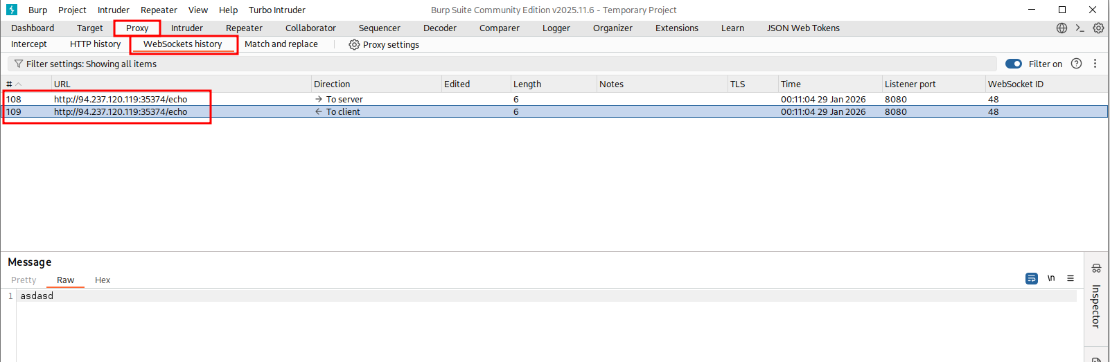 You can find all the websocket connections you had in Proxy -> WebSockets History.