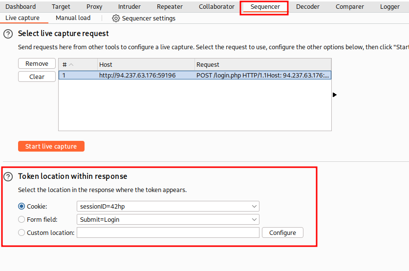 First, we send the login request to burp sequencer