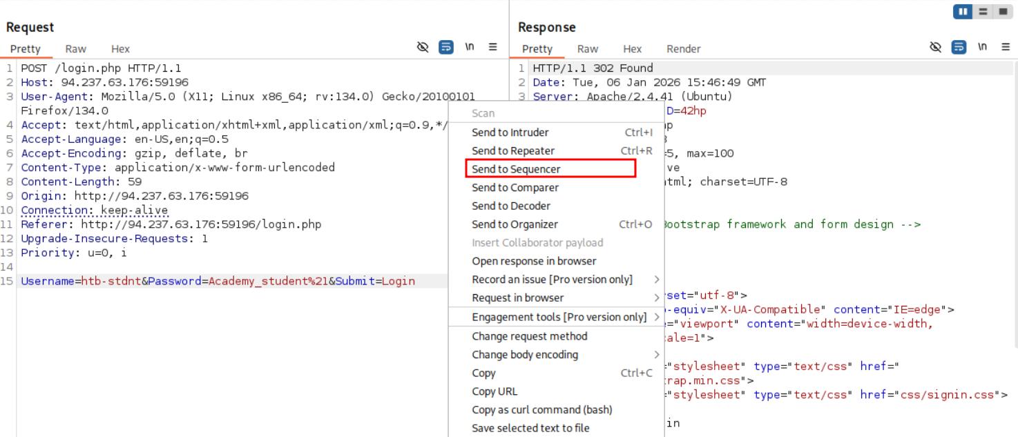First, we send the login request to burp sequencer