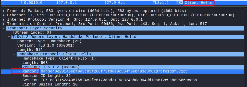 We need to open the file in Wireshark, select a ClientHello message and copy the Random field as Hex stream